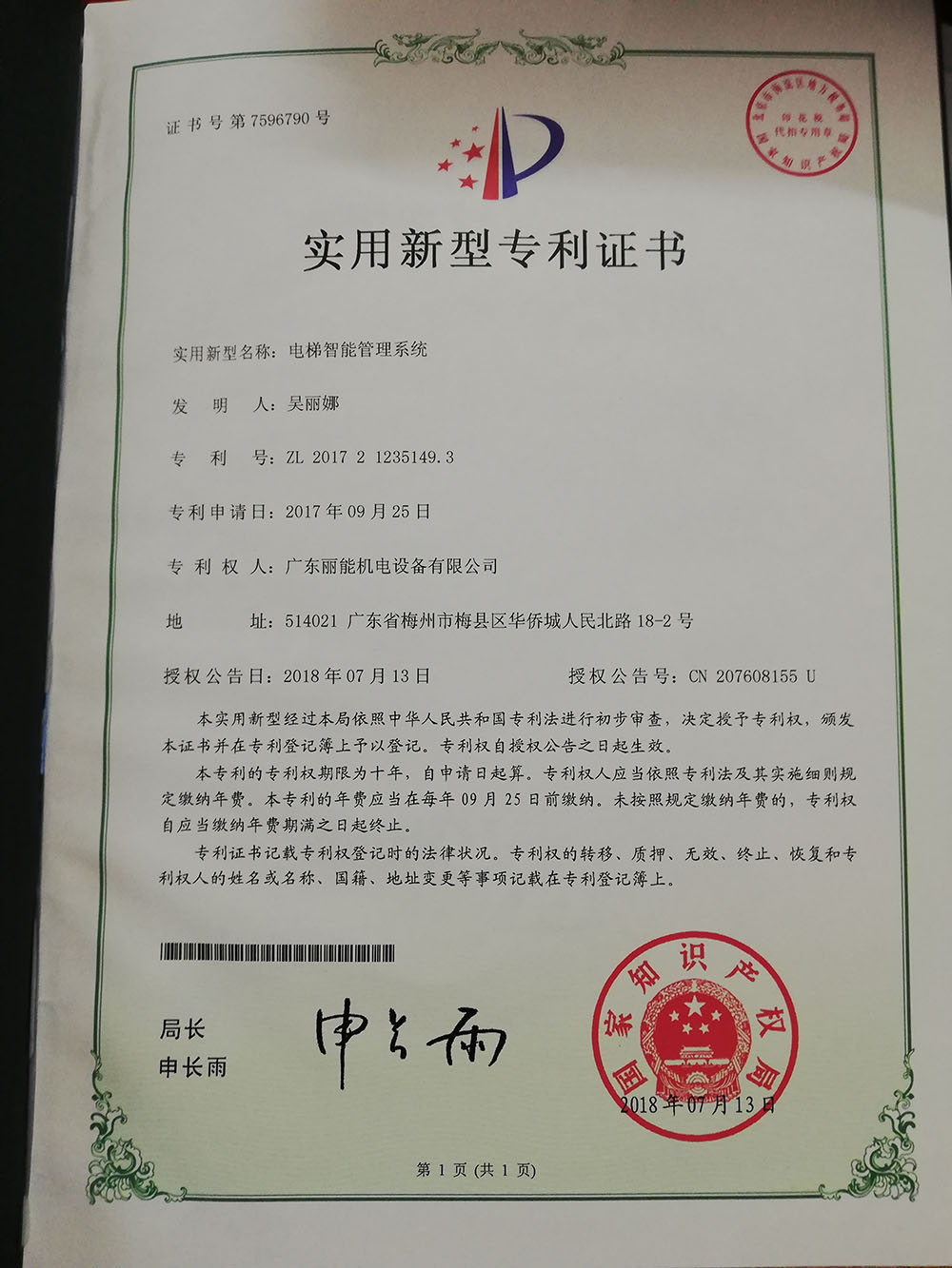 實用新型專利證書(實用新型名稱:電梯智能管理系統(tǒng) / 專利號:ZL 2017 2 1235149.3)