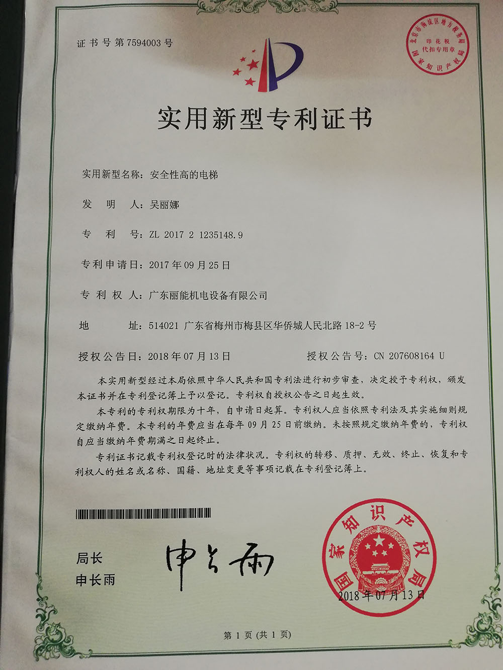 實用新型專利證書(實用新型名稱:安全性高的電梯 / 專利號:ZL 2017 2 1235148.9)