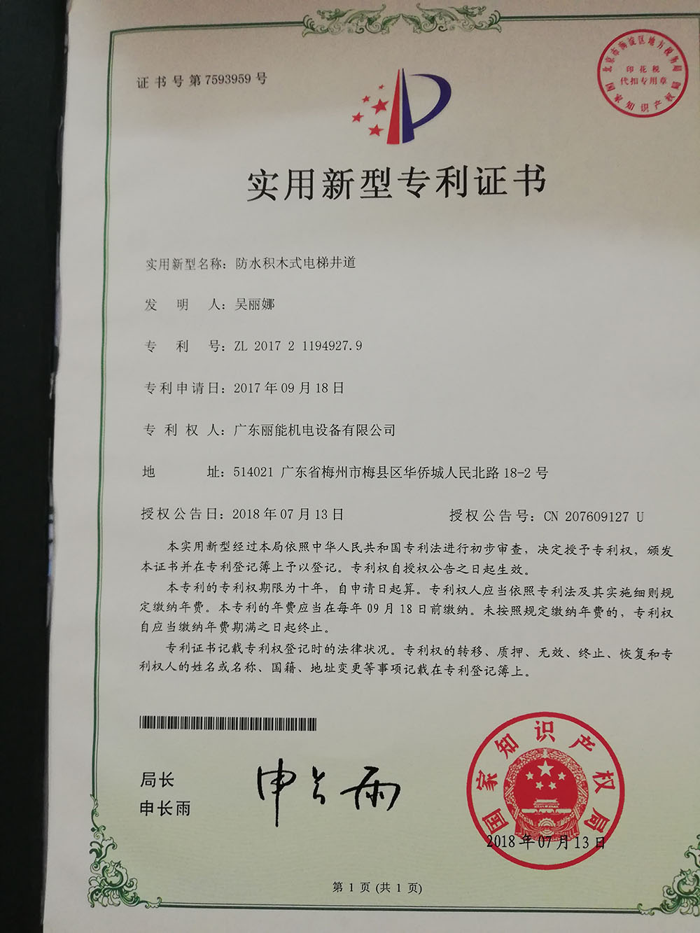 實用新型專利證書(實用新型名稱:防水積木式電梯井道 / 專利號:ZL 2017 2 1194927.9)